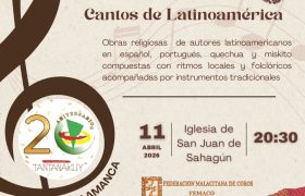 Obras religiosas de autores latinoamericanos en español, portugués, quechua y miskito compuestas con ritmos locales y folclóricos, acompañadas por instrumentos tradicionales, mas información https://www.diocesisdesalamanca.com/agenda/concierto-coral-iberoamericana-tantanakuy-iglesia-san-juan-de-sahagun/